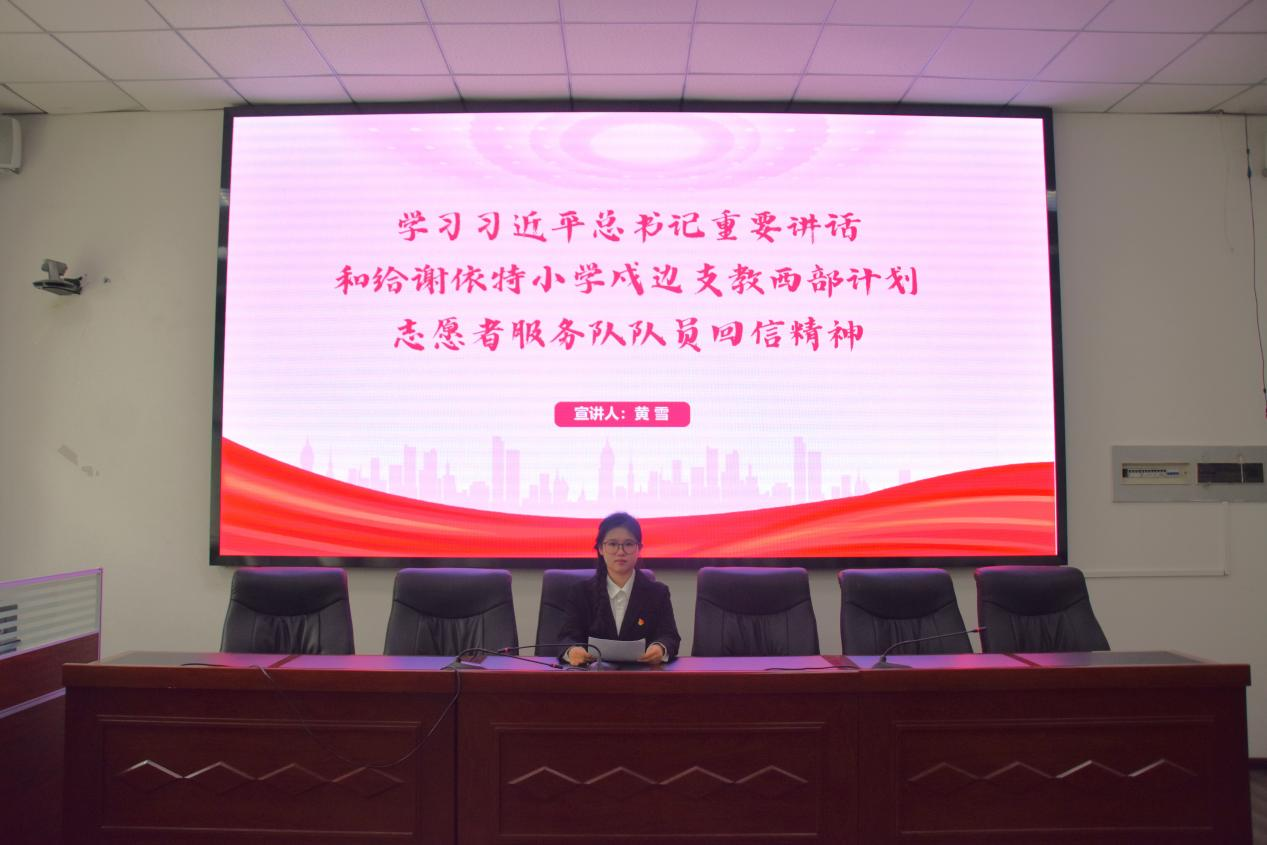 宣講中,黃雪同學詳細解讀了習近平總書記重要講話的核心要義以及給謝依特小學戍邊支教西部計劃志愿者服務隊隊員回信的精神實質。她圍繞“青年應在中國式現(xiàn)代化建設中積極作為”的核心觀點展開論述,從牢記囑托、對標榜樣、投身偉業(yè)、凝聚力量四個方面,闡述了青年學生在新時代的使命擔當,同時號召青年學生要練就過硬本領,發(fā)揚奮斗精神,投身復興,建設西部。