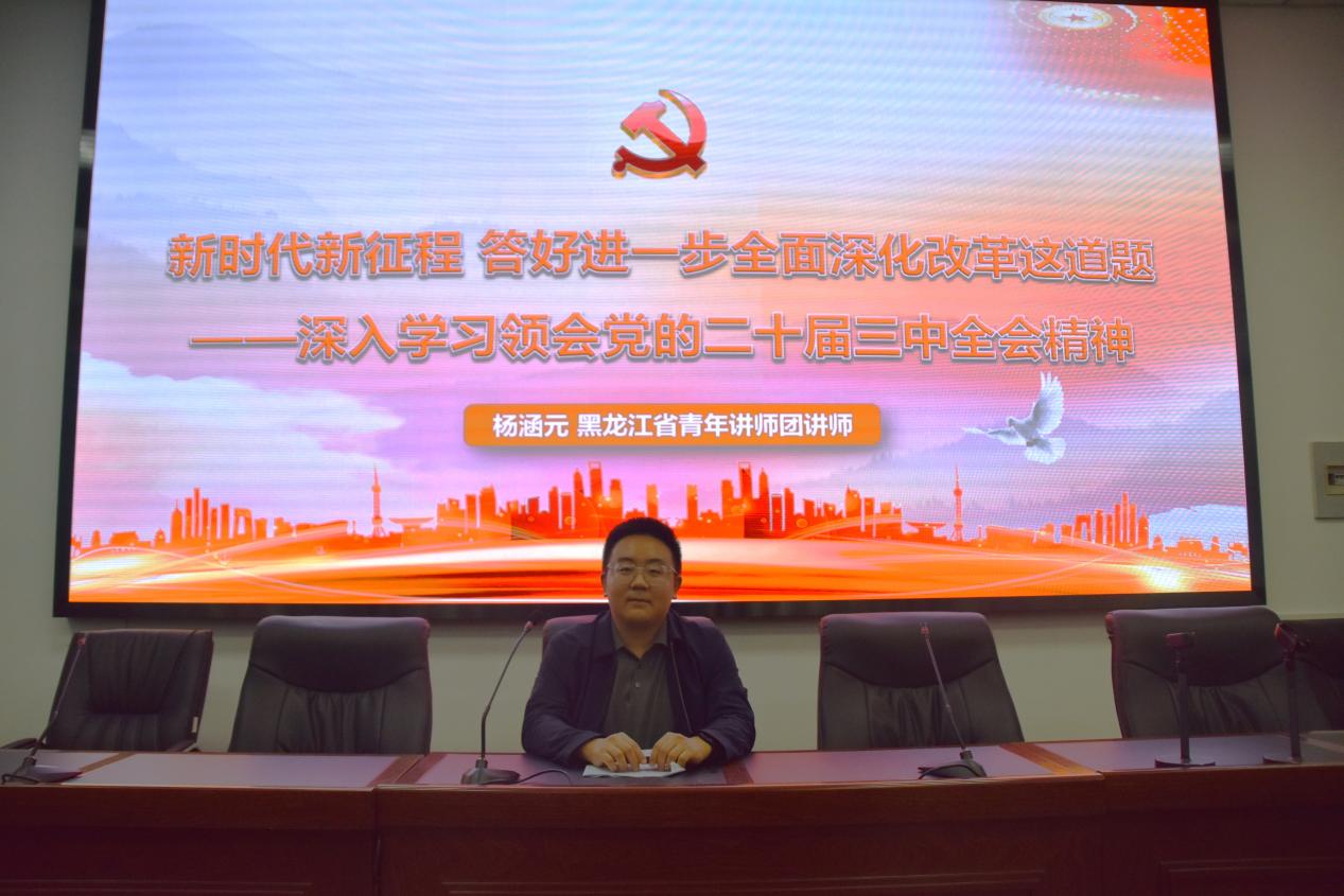楊涵元以“新時(shí)代新征程,答好進(jìn)一步深化改革這道題”為題,對(duì)黨的二十屆三中全會(huì)的主要目標(biāo)、重大舉措和歷史意義等進(jìn)行闡釋和解讀。并號(hào)召大家要認(rèn)真學(xué)習(xí)貫徹黨的二十屆三中全會(huì)精神,深刻領(lǐng)悟“兩個(gè)確立”的決定性意義,增強(qiáng)“四個(gè)意識(shí)”、堅(jiān)定“四個(gè)自信”、做到“兩個(gè)維護(hù)”,高舉改革開(kāi)放旗幟,凝心聚力、奮發(fā)進(jìn)取,為全面建成社會(huì)主義現(xiàn)代化強(qiáng)國(guó)、實(shí)現(xiàn)第二個(gè)百年奮斗目標(biāo),以中國(guó)式現(xiàn)代化全面推進(jìn)中華民族偉大復(fù)興而努力奮斗。
