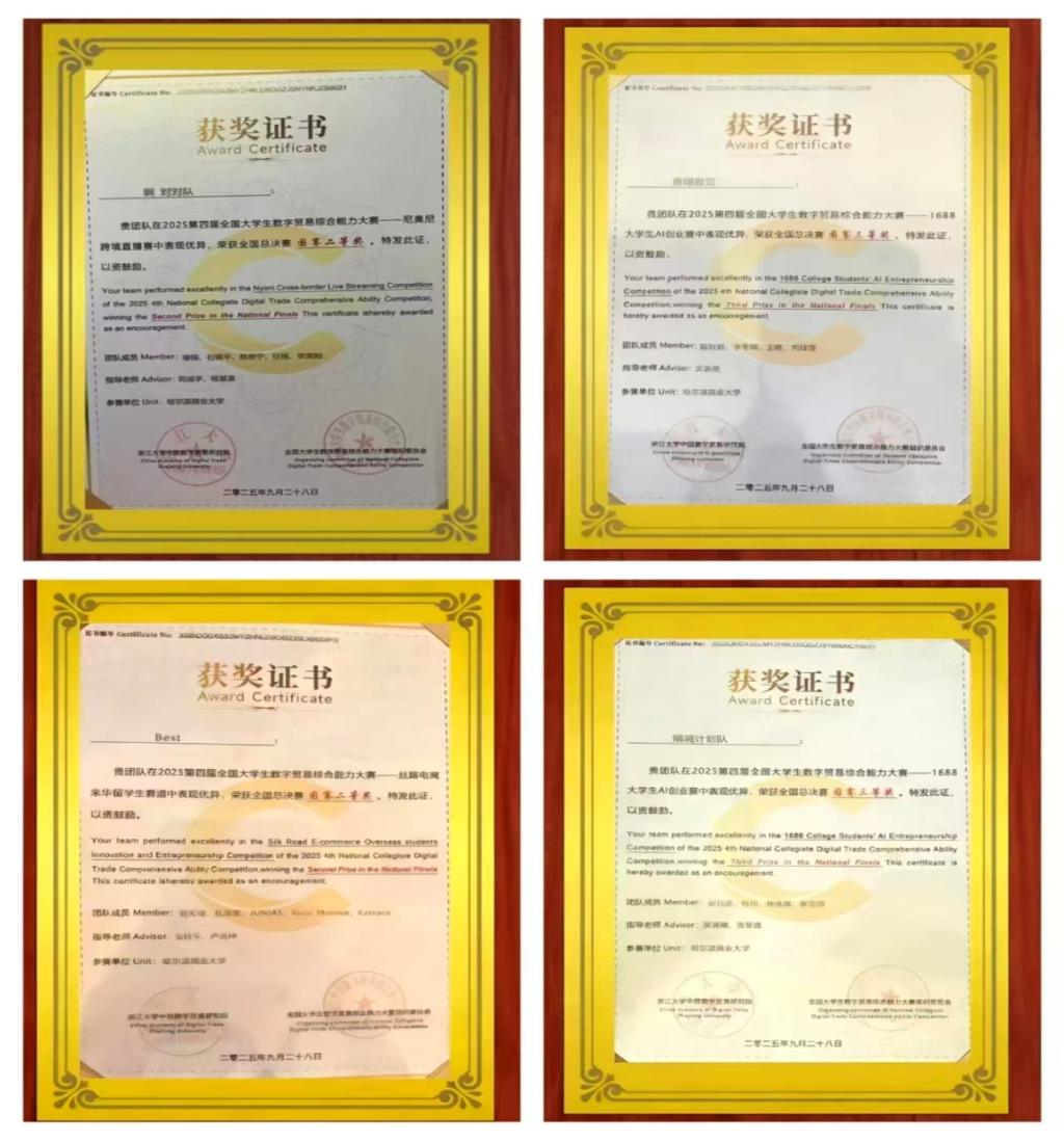 本屆大賽規(guī)模盛大,高手云集,吸引了來自全國98所高校的上千名選手參與。賽事層層篩選,競爭異常激烈。在“尼奧尼跨境直播賽道”中,由楊慧瀛、司成宇老師指導,穆桐、石錦平、趙思寧、任格、李昊陽同學組成的“啊 對對隊”,憑借敏銳的市場洞察與嫻熟的專業(yè)技能,榮獲國家二等獎;在“東方杯絲路電商留學生賽道”上,由張秋平、盧尚坤老師指導,劉天琦、趙澤寰、JUNIAS. Kuru_Momoe.、Kamara同學組成的“Best隊”,以跨文化協(xié)作能力與創(chuàng)新思維,喜獲全國二等獎;在“1688大學生AI創(chuàng)業(yè)賽道”中,由吳英艷、張春建老師指導,孫浩翼、秦佳豪、林川、李若語同學組成的“熵減計劃隊”,以及由吳英艷老師指導,陳秋如、李冬梅、王萌、劉佳雯同學組成的“青珵數(shù)貿(mào)隊”兩支隊伍均展現(xiàn)扎實的專業(yè)素養(yǎng)與創(chuàng)新實踐能力,雙雙榮獲國家三等獎!