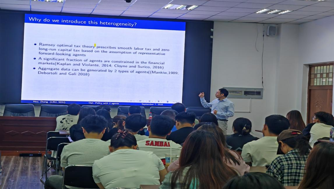 9月8日下午,經(jīng)濟(jì)學(xué)院在1102會(huì)議室舉辦了“青年學(xué)者工作坊”專題講座。本次講座邀請了遼寧大學(xué)中國經(jīng)濟(jì)研究院助理教授侯尚迪博士擔(dān)任主講嘉賓,經(jīng)濟(jì)學(xué)院韓朝亮教授主持講座。侯尚迪教授以“異質(zhì)性模型中的最優(yōu)財(cái)政政策”為主題,深入探究了當(dāng)部分家庭無法持有金融資產(chǎn)(如儲(chǔ)蓄、債券等)時(shí),政府如何運(yùn)用稅收和政府債務(wù)工具來熨平經(jīng)濟(jì)周期,從而最大化全體社會(huì)成員的福利。
