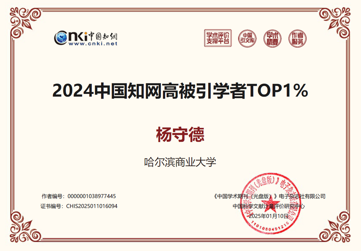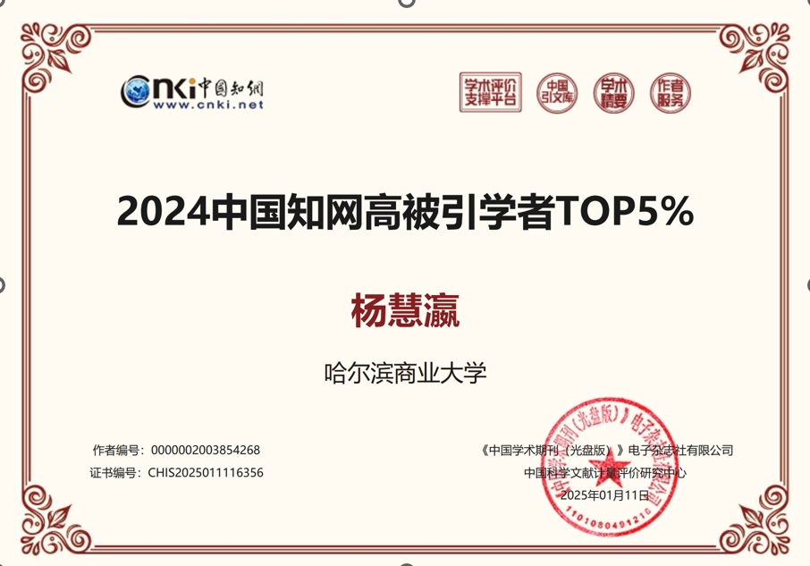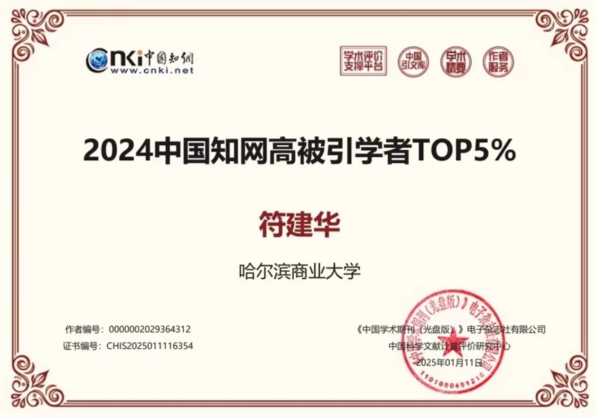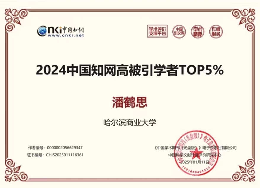 近日,中國知網公布了“2024中國知網高被引學者預發(fā)布名單”,哈爾濱商業(yè)大學經濟學院4位學者入選。其中,楊守德入選應用經濟學中國知網高被引學者TOP1%;符建華、楊慧瀛、潘鶴思三位教師入選應用經濟學中國知網高被引學者TOP5%。