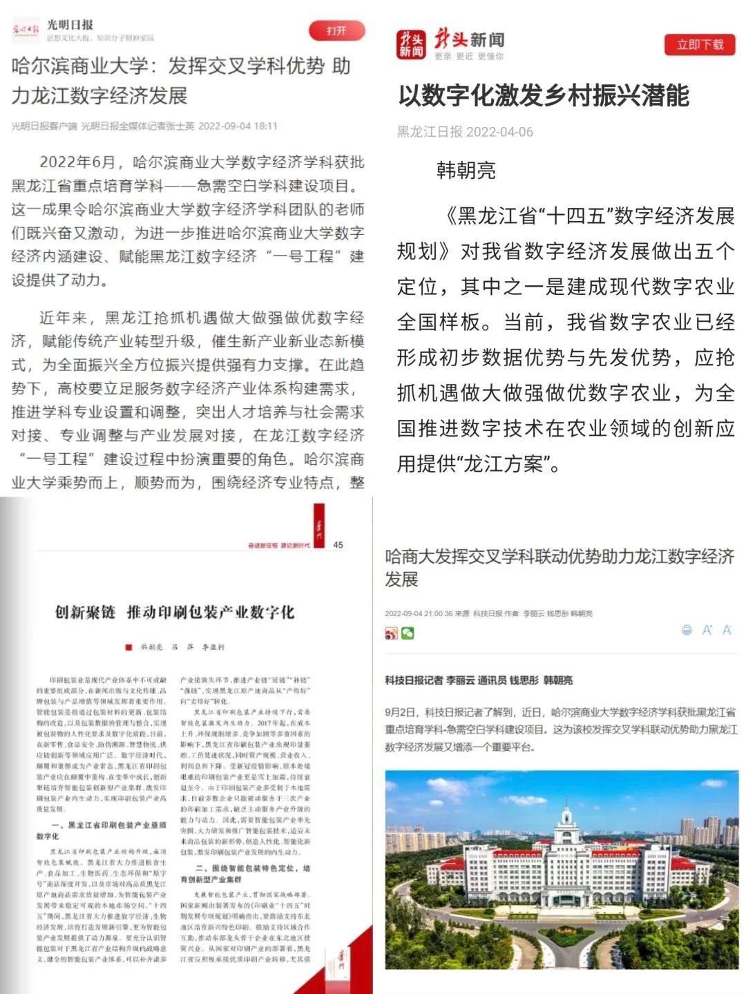 發(fā)展數(shù)字經(jīng)濟是把握新一輪科技革命和產(chǎn)業(yè)變革新機遇的戰(zhàn)略選擇。近年來,黑龍江省搶抓機遇做大做強做優(yōu)數(shù)字經(jīng)濟,賦能傳統(tǒng)產(chǎn)業(yè)轉型升級,催生新產(chǎn)業(yè)新業(yè)態(tài)新模式,為高質量發(fā)展可持續(xù)振興提供強有力支撐。作為龍江數(shù)字經(jīng)濟“一號工程”建設的重要參與力量,哈爾濱商業(yè)大學數(shù)字經(jīng)濟學科團隊明確學科發(fā)展路徑,整合專業(yè)優(yōu)質資源,突出人才培養(yǎng)與社會需求對接、專業(yè)調整與產(chǎn)業(yè)發(fā)展對接,協(xié)同開展數(shù)字經(jīng)濟研究攻關,助力龍江數(shù)字經(jīng)濟建設與發(fā)展,打造龍江經(jīng)濟發(fā)展新引擎。