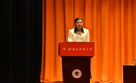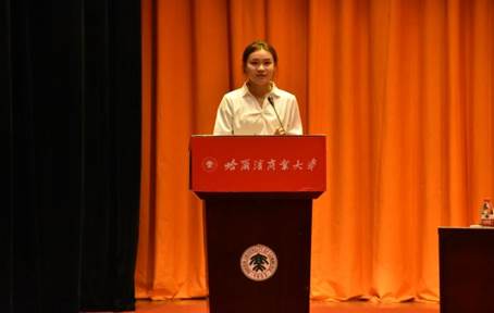 數(shù)字經(jīng)濟(jì)2025—2班張子涵作為新生代表發(fā)言發(fā)言,她深情回憶接到錄取通知書(shū)時(shí)的喜悅與憧憬,抒發(fā)對(duì)大學(xué)生活的美好憧憬與堅(jiān)定信念,她號(hào)召全體新生在哈商大錘煉意志、練就本領(lǐng)、勇于擔(dān)當(dāng),傳承校訓(xùn)精神,以青春之我唱響挺膺擔(dān)當(dāng)?shù)摹扒啻褐琛薄?/p>