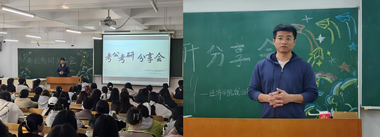 為助力經(jīng)濟(jì)學(xué)院學(xué)子應(yīng)對(duì)考研考公挑戰(zhàn),幫助學(xué)生明晰備考方向,掌握有效備考策略,學(xué)院就業(yè)創(chuàng)業(yè)服務(wù)中心近日在0211教室舉辦2025年度經(jīng)濟(jì)學(xué)院考公考研分享會(huì),韓朝亮院長(zhǎng)、張文媛老師、劉鑫老師、周浩楠老師出席本次活動(dòng)。活動(dòng)旨在打破考公考研信息壁壘,通過師生互動(dòng)、朋輩交流,提供個(gè)性化指導(dǎo),緩解備考焦慮,助力學(xué)生明確目標(biāo)、提升競(jìng)爭(zhēng)力。在會(huì)上,韓朝亮院長(zhǎng)立足當(dāng)前社會(huì)就業(yè)背景,結(jié)合學(xué)科特點(diǎn),分析當(dāng)前考公、考研嚴(yán)峻形勢(shì),并對(duì)畢業(yè)生面臨的機(jī)遇與挑戰(zhàn)作出深度剖析,就專業(yè)層面給予同學(xué)靶向引導(dǎo)。