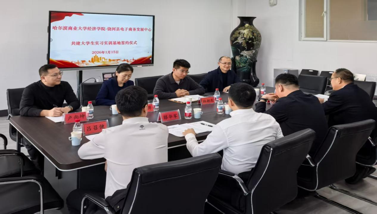 為進一步深化校地合作,共育新商科人才,搭建高校與地方資源共享、優(yōu)勢互補的合作平臺。1月15日,哈爾濱商業(yè)大學經(jīng)濟學院與饒河縣舉行校地合作暨共建實習實訓基地簽約揭牌儀式。饒河縣委常委、副縣長辛延平,饒河縣電子商務發(fā)展中心主任滕華軍,外經(jīng)貿主任呂召健,職教中心校長陳德新,經(jīng)濟學院院長韓朝亮,國際經(jīng)濟與貿易教研室主任張金萍,數(shù)字經(jīng)濟教研室主任尹龍,饒河援邊教師盧尚坤出席會議。會議由韓朝亮主持。